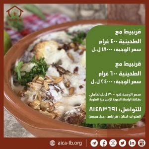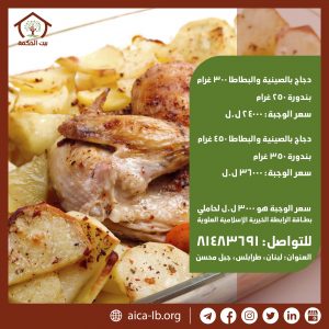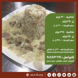 ملاحظة: يذهب ريع هذه الوجبات لدعم الأسر الأكثر فقراً في منطقة جبل محسن عبر بطاقة الرابطة الخيرية الإسلامية العلوية التي تخول حامليها الحصول على الوجبة بسعر ٣،٠٠٠ ل.ل. فقط لا غير