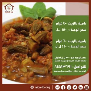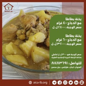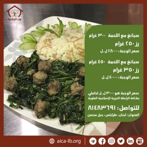 ملاحظة: يذهب ريع هذه الوجبات لدعم الأسر الأكثر فقراً في منطقة جبل محسن عبر بطاقة الرابطة الخيرية الإسلامية العلوية التي تخول حامليها الحصول على الوجبة بسعر ٣،٠٠٠ ل.ل. فقط لا غير