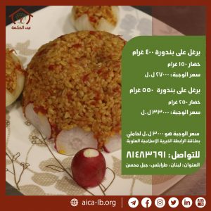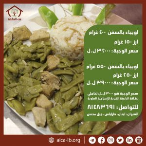 ملاحظة: يذهب ريع هذه الوجبات لدعم الأسر الأكثر فقراً في منطقة جبل محسن عبر بطاقة الرابطة الخيرية الإسلامية العلوية التي تخول حامليها الحصول على الوجبة بسعر ٣،٠٠٠ ل.ل. فقط لا غير